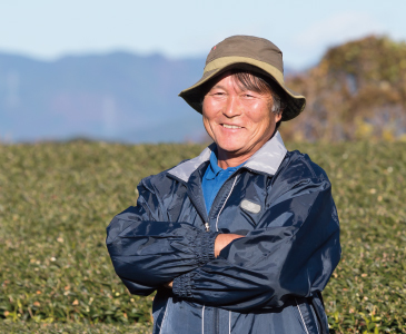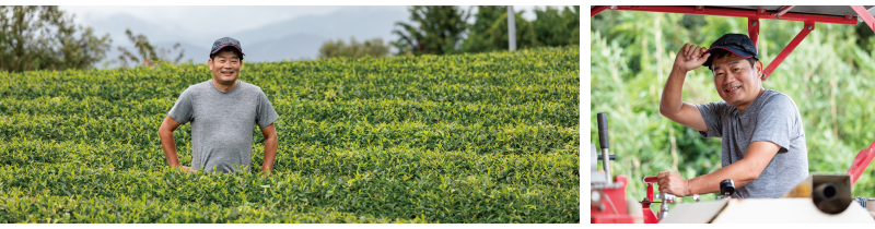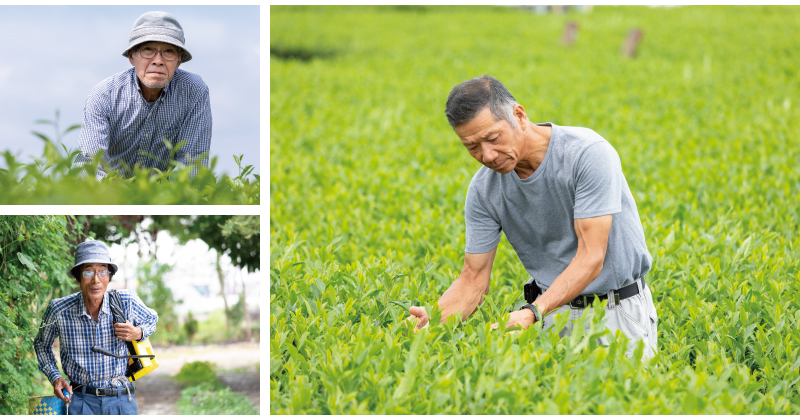 若い頃から、兼業農家として茶づくりに携わってきましたが、50歳を機に、茶業一本に絞り、手掛ける茶園も増畑し、土づくりから丹精込めてお茶づくりに励んでいます。いつでも暇さえあれば、茶園を見回り、害虫がつかないよう、一本一本の木を丁寧に見守っています。週末は、娘夫婦も手伝いに来てくれるので、親子二代で畑仕事をしています。次世代につながるお茶づくりを目指し、日々精進しています。